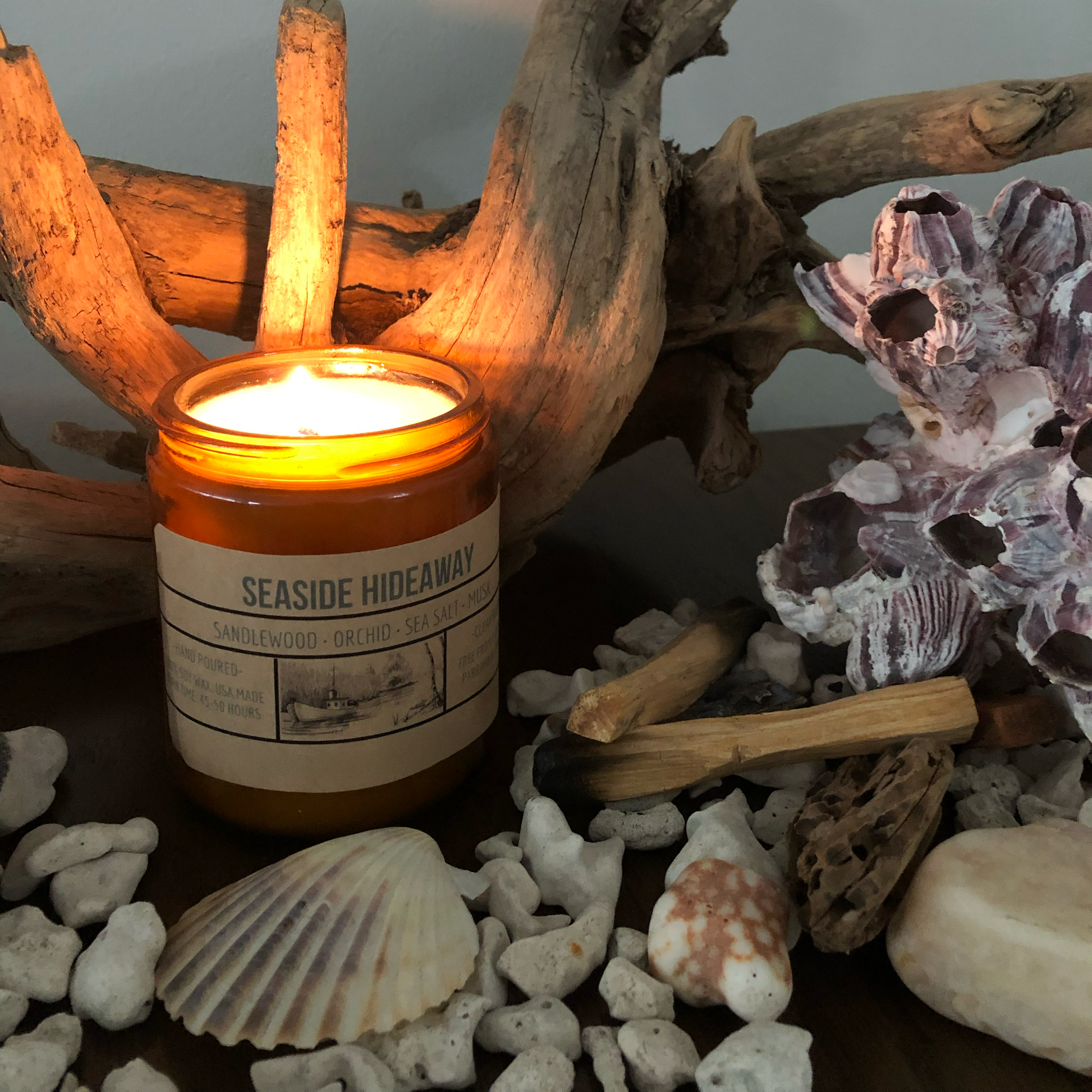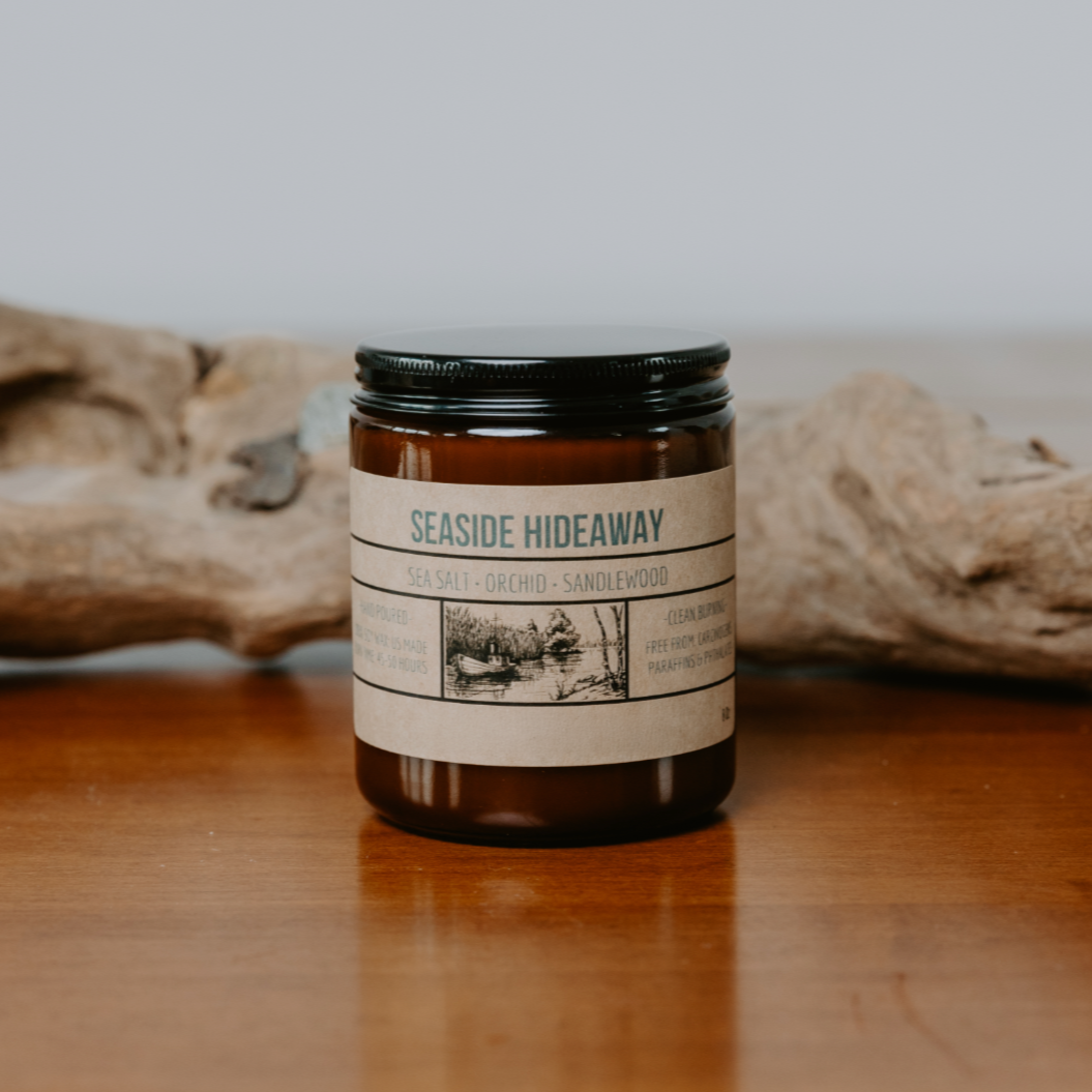 Slip away to the shoreline with Seaside Hideaway, a serene blend of sea salt, orchid, and warm sandalwood. This candle captures the feeling of a quiet cove—where ocean breeze meets blooming florals and driftwood warmth lingers in the air.